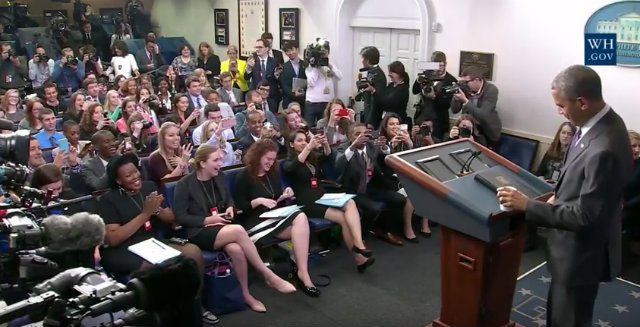 Obama’s first questioner, a reporter from Rutgers, gave some history of the school newspaper before noting his nervousness (Obama’s advice: “pretend like this is routine.”) Given that the president plans to speak at their commencement, he asked, “would you be interested in being interviewed by our newspaper?” (Obama: “I’m favorably disposed”).