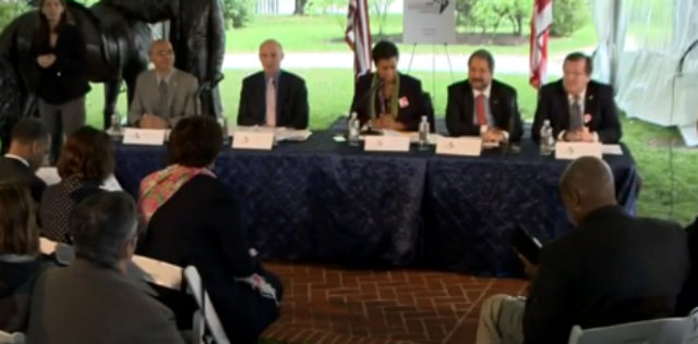 Flanked by the other members of the New Columbia Statehood Commission—D.C. Shadow Senators Michael Brown and Paul Strauss, U.S. Shadow Representative Franklin Garcia, and D.C. Council Chair Phil Mendelson—Bowser noted that the event taking place at Lincoln’s Cottage, where the president penned the Emancipation Proclamation, was of special significance.
