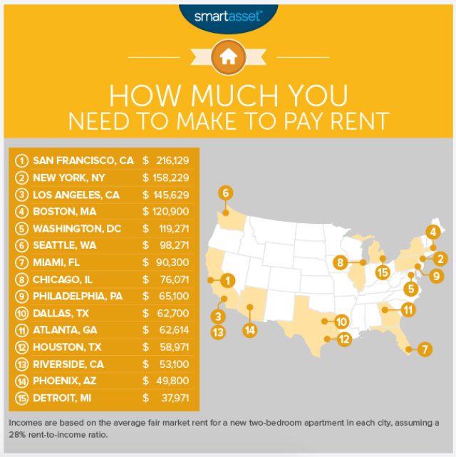 The U.S. Department of Housing and Urban Development recommends that households spend 30 percent or less of their income on rent. To meet that requirement, families must earn an annual income of $119,271 to afford a two-bedroom apartment here, according to a study from SmartAsset. (The study used a 28 percent rent-to-income ratio.)
