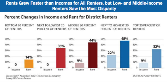 While rent continues to increase and low-cost rentals become more scarce, incomes have not risen at the same rate, according to a study from the D.C. Fiscal Policy Institute.