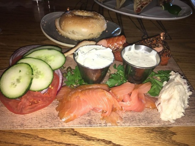 Now those same smoked goods can be had at the upstairs restaurant, including what may be the city’s best seafood charcuterie: the Ivy City Smokehouse Platter for $20. That sweet Indian Candy and thinly sliced salmon is joined by a whitefish salad that is heavy on chunks of fish, using only as much mayonnaise as it needs, along with peppercorn-laced cuts of hot smoked pepper salmon and smoked rainbow trout, all laid out on a board with vegetable cream cheese, garnishes, and bagels from Lyon Bakery.