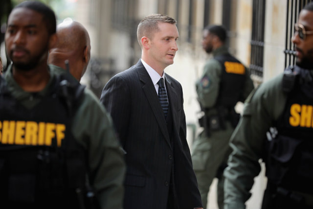 Baltimore Police Officer Edward Nero (C) arrives at the Mitchell Courthouse-West on the day a judge will issue a vertict in his trial May 23, 2016 in Baltimore, Maryland. (Photo by Chip Somodevilla/Getty Images)