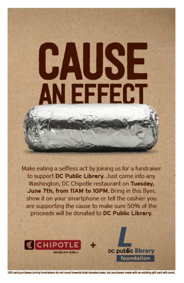 Burrito lovers who mention D.C. Public Library at a Chipotle restaurant today will give the system a small donation.