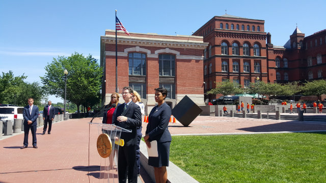 Deputy Mayor for Public Safety and Justice Kevin Donahue speaks at a news conference outside the Holocaust Museum. with Department of Consumer of Regulatory Affairs Director Melinda Bolling, Police Chief Cathy Lanier, and Mayor Muriel Bowser. (Photo by Rachel Sadon)
