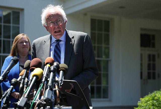Sen. Bernie Sanders speaks to members of the media as his wife Jane O’Meara Sanders looks on after an Oval Office meeting with President Barack Obama. (Photo by Alex Wong/Getty Images)