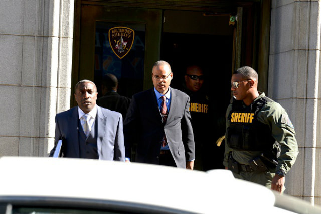 Officer Caesar Goodson Jr., center, exits the Circuit Court on the first day in the trial on June 9, 2016 in Baltimore, Maryland. (Photo by Bryan Woolston-Pool/Getty Images)