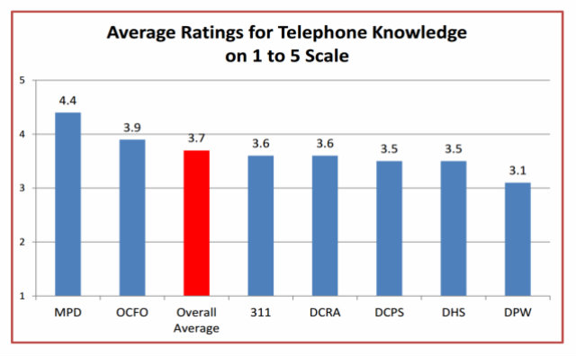 The worst in terms of both knowledge and courtesy over the telephone was the Department of Public Works (DPW), the Department of Human Services (DHS), and the Department of Consumer and Regulatory Affairs (DCRA). The Metropolitan Police Department (MPD) and the Office of the Chief Financial Officer (OCFO) fared much better. In terms of testing their email knowledge, MPD once again came out on top, followed by DCRA; DHS was at the bottom of the heap.