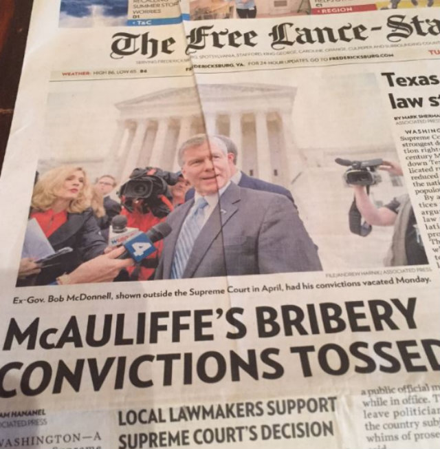 That’s right, the Fredericksburg, Va. newspaper used the name of current Virginia Governor Terry McAuliffe instead. It is a little confusing—after all, McAuliffe is also under investigation for donations to his gubernatorial campaign.