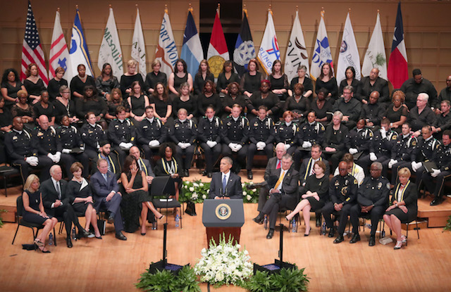 “From the moment you put on that uniform, you have answered a call that at any moment, even in the briefest interaction, may put your life in harm’s way,” Obama said, detailing how the five fallen officers came to be members of the force. “Like police officers around the country, these men and their families shared a commitment to something larger than themselves.”