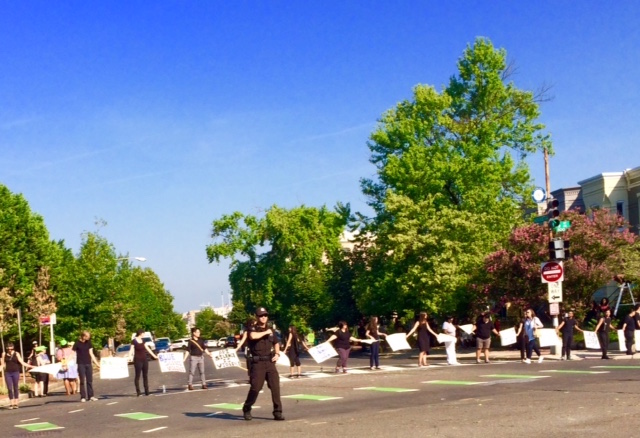 Original: About 50 protesters with Black Lives Matter DC and Black Youth Project 100 are protesting outside the legislative office of the National Fraternal Order of Police in Northeast, blocking traffic on Massachusetts Ave.