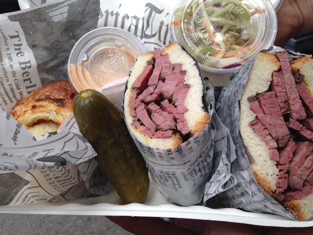 Knishes, pastrami, and sour pickles are just a few of the kosher offerings from Brooklyn Sandwich Co. (Photo by Evan Caplan)