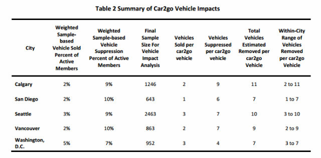 In total, that means 4,600 fewer vehicles in D.C., either because owners sold their cars or car2go users chose not to buy one in the first place, the researchers found. In other cities, the effect was even more pronounced. In Calgary, for example the service took an estimated 11 cars of the road per car2go vehicle, for a total of 6,058.