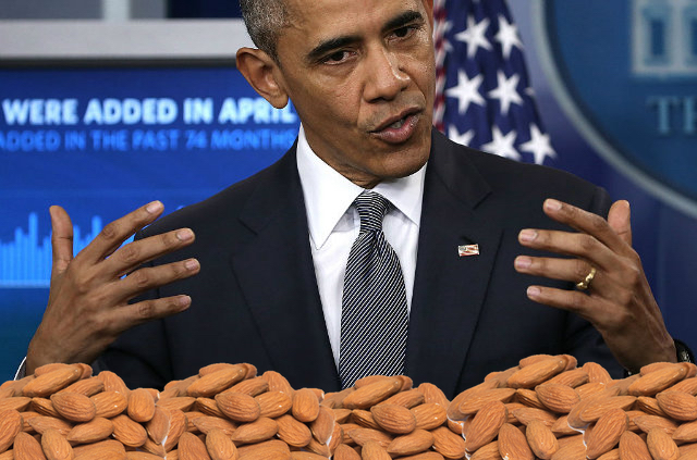 While Obama maintains that “almonds are a good snack” he may have more or less than seven on any given day. He did not comment on chocolate-covered almonds.