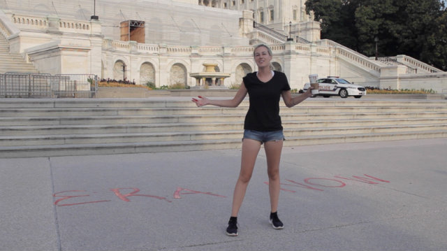 Natalie White poses in front of her message to Congress. (Still courtesy of Sheila Maria Lobo, from the upcoming documentary NSFW: Not Suitable for Women)