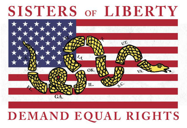 Her latest show, “Natalie White for Equal Rights,” featured a bronze bust of her nude body, clad only in combat boots, holding an American flag. She also reappropriated symbols from the Revolutionary War to read as feminist anthems. She changed “Sons of Liberty, Defend the Republic” into “Sisters of Liberty, Demand Equal Rights” and rearranged the iconic Join, or Die political cartoon to include the states that didn’t ratify the ERA.