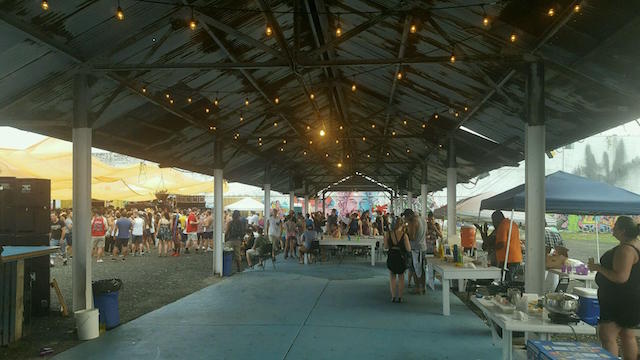 When you enter the D.C. Pavilion, the space feels vast. Adkins says it can hold 4,500 people. Aside from the picnic tables spanning the lot’s length, covered by an industrial-looking roof, there is a ton of room for games like bocce ball and, potentially, laser tag, which is in the works, according to Puesan. To the side of the tables where we’re sitting is a stage, bookended by 40 by 40 foot shipping crates that hold equipment.