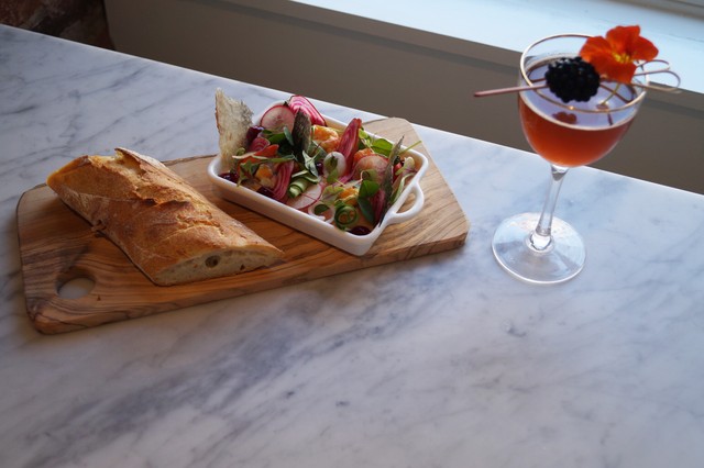 On a recent visit, the menu included a smoked salmon rillette with cucumber, pickled berries, lemon, and crème fraiche. Other options included avocado toast with local greens, a soba bowl with kale kimchi, and rockfish ceviche with grapefruit, charred scallion, crispy quinoa and fresno chili. The kitchen set up is relatively small at the moment, but expansion is underway, and Whaley says diners can expect a lot more pastas, meats and charcuterie as things get up to speed.