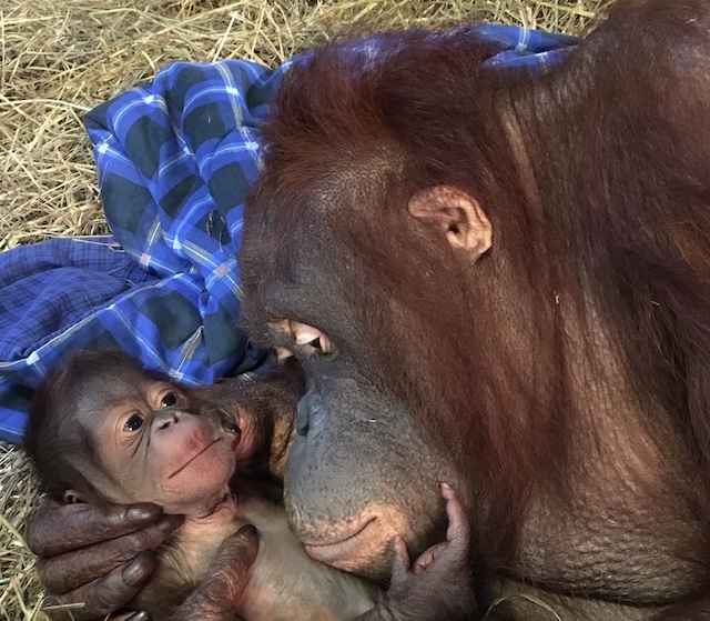 Bornean orangutan Batang gave birth just before 9 p.m. Monday evening to a male—the first orangutan birth at the Smithsonian’s National Zoo in a quarter century.