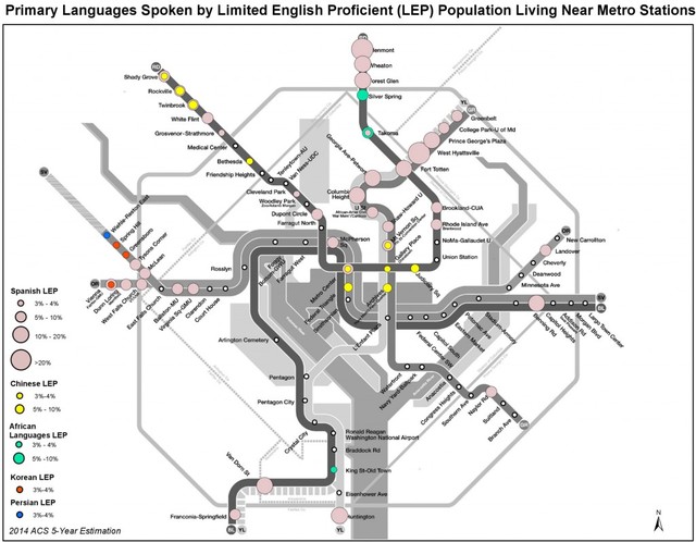 Head up to the northern, eastern end of the Red Line and you might hear Tagalog. Get off at the Wiehle station and you may very well meet a Persian language speaker. More likely, though, Metro riders around the region are likely to hear Spanish, Korean, Vietnamese, a Chinese language, French, Arabic and Amharic—the top seven tongues in the D.C. region served by WMATA.