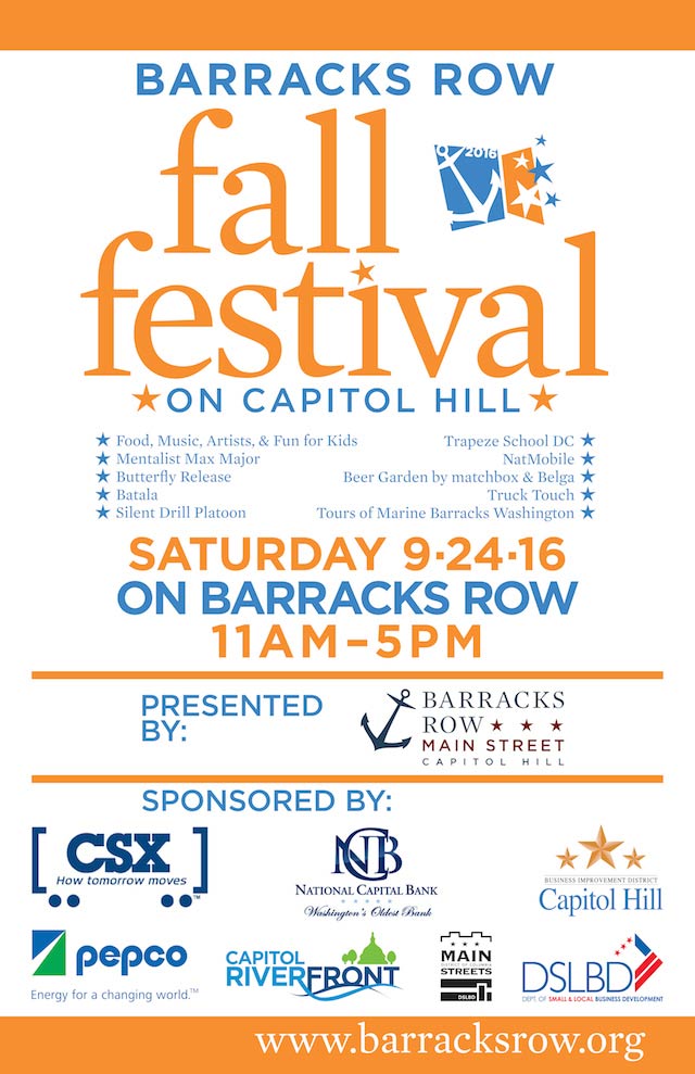 Very small town but very urban, very international but very American—Barracks Row Main Street’s Fall Festival this Saturday September 24th is both edgy and sweetly homespun. Admittance is free, and the festival is easy to find: take Eastern Market Metro (Orange-Blue-Silver). Walk ahead 60 feet from METRO escalator and look right—you’ll spot over 100 tents nestled near Marine Barracks Washington. Spend the afternoon on a well-curated shopping adventure or take the docent-lead barracks tours!