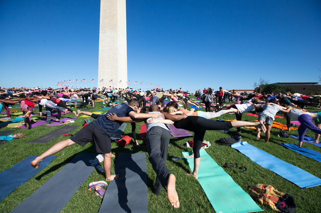 Stressed over the debate? Missing sunshine? Maybe take a deep breath and pretend like you’re doing yoga on the Mall. For the 11th year in a row, around 5,000 people brought their mats to “America’s front yard” for a giant group practice. It was originally planned for the end of Yoga Week in May, but rescheduled due to rain. Photographer Alex Edelman captured this year’s twists and turns.