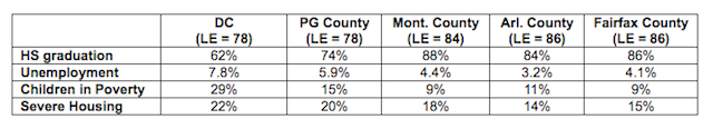 In Fairfax and Arlington, for instance, there are higher rates of high school graduation, and lower rates of unemployment, children in poverty, and bad housing situations than in Prince George’s and D.C., per the RWJF’s county rankings.