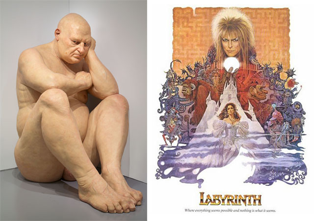 Ron Mueck, Untitled (Big Man), 2000 (Cathy Carver/Hirshhorn), and a poster for Labyrinth (courtesy of the Hirshorn)