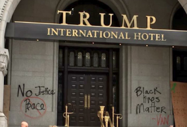 One claim that is indisputable: as of Saturday afternoon, graffiti defaced the front of the building. Someone spray painted the words “Black Lives Matter” and “No Justice, No Peace” on the granite walls in front of Trump International Hotel’s entrance on 12th Street.