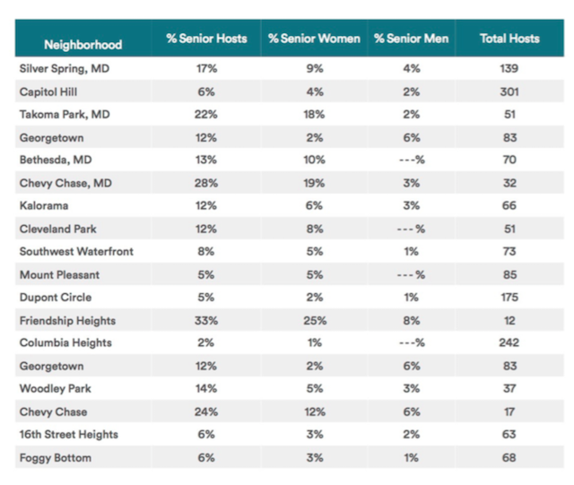 About 12 percent of the total D.C.-area hosts this year are seniors, says Airbnb, which amounts to a 275 percent increase since 2014. In some neighborhoods, seniors represent even larger slices of the host pie. A third of total hosts in Friendship Heights are seniors, followed by 28 percent in Chevy Chase, Md., and 24 percent in D.C.’s Chevy Chase. (The company notes that neighborhoods with the most senior hosts also have the most senior women residents.)