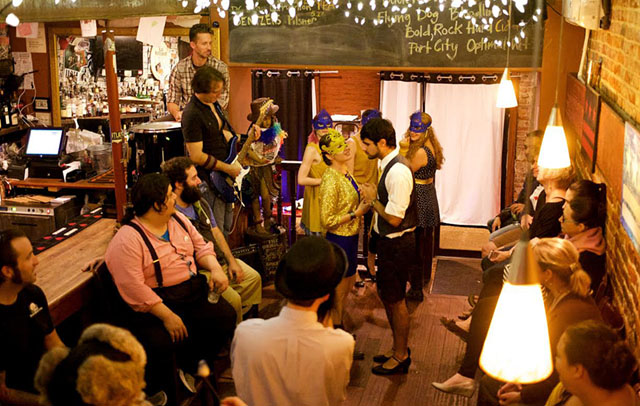While plenty of local theaters (God bless ‘em) have had the good business sense to offer libations, you and your adult sippy cup of merlot are still expected to stay in your seat. During LaBEERS, however, you don’t have to wait until intermission to get a fresh pour, and moving around is encouraged. There’s even a catchy song for it! You’ll know it’s time to relocate when two-man house band A Rustic Riot starts singing, “It’s time you move your ass to the other side of the bar.” It’s kind of nice to stretch your legs.