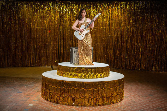 Kjartansson’s newest musical performance piece, Woman in E, will be central to the Hirshhorn show. The performance features a woman in a glittery gold dress standing on a revolving pedestal and playing an E-minor chord over and over on an electric guitar.
