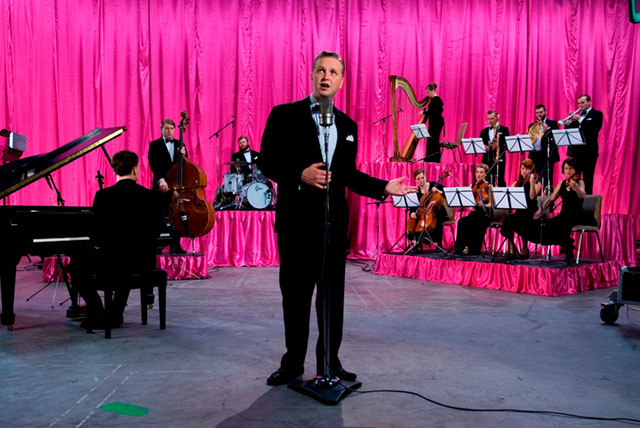 Many of Kjartansson’s video works combine the slow-TV mentality with calming, profoundly ambient music. The video installation God features Kjartansson in a black tux, singing the words “Sorrow conquers happiness” over and over, like a slow dance Frank Sinatra with a small orchestra behind him.