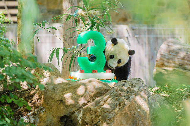 Bao Bao inspected her frozen birthday cake at a triple birthday panda party in August. (Courtesy of the Smithsonian National Zoo)