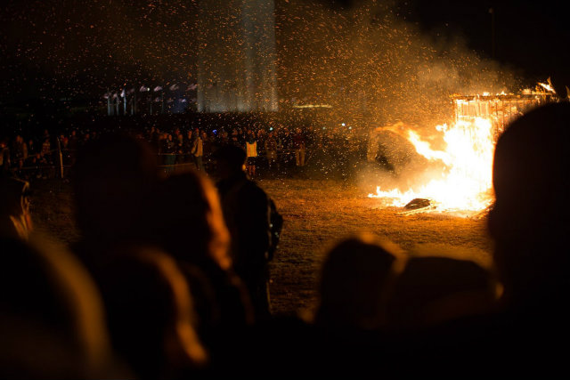 A crowd watches as a specially built temple burned to the ground near the Washington Monument in 2015. (Photo by Benjamin Strahs)