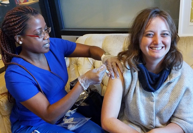 Anyangwe, a registered nurse with Passport Health, estimated that she’d given out around 30 shots over the course of the afternoon—ferried from office to office via Uber. “It’s been interesting,” she said, ticking off the places she’d given the injections: a gym, a bathroom, conference rooms. As for the person who wanted to get it done at a Starbucks, she suggested a nearby office lobby instead.