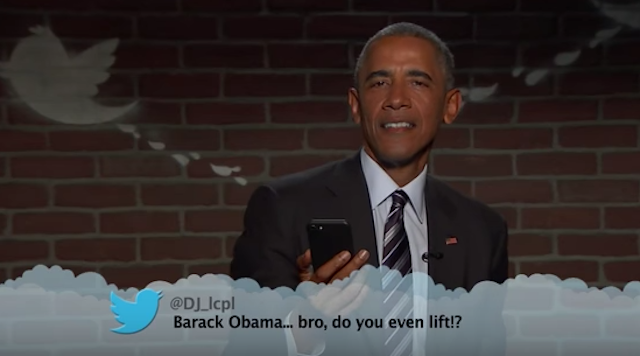 In our write-up of his first appearance on Mean Tweets, we said, “Of course, these weren’t the horrible, racist crazy things that are Tweeted about Obama—it’s not like they had him read Donald Trump’s Tweets.” But you know what they say about sequels: they’ve got to push the limit, and, as Randy from Scream observed, the body count is always bigger.