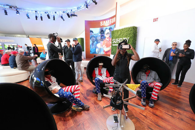 People try out the Samsung Gear VR at the Ryder Cup 2016 on September 30 in Chaska, Minnesota. (Photo by Adam Bettcher/Getty Images for Samsung)