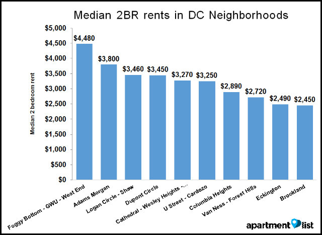 Among other neighborhoods where rent is above D.C.’s average are Adams Morgan, Logan Circle, Shaw, and Dupont Circle, but prices for two-bedrooms in these places are still about $680 to $1,030 cheaper, on average, than what it’ll cost in Foggy Bottom.