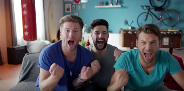 The ad pictures four coiffed dudes hanging out in the most teal man cave I’ve ever seen, three of them sporting Macklemore hair cuts and the fourth, who is left out of the bro-tastic hugs and celebrations, with a more Kenny G-esque style.