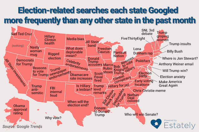 D.C. pretty much performs to stereotype, asking the search engine about the Hatch Act, which limits federal government employees (with some exceptions, like the president and VP) from directly campaigning or swaying elections. It became a topic of interest after accusations that FBI head James Comey violated it with his letter to Congress about Hillary Clinton’s emails. Other searches included ABC Tracking Poll, Donna Brazile (the interim Democratic National Committee Chair), and bad hombre shirts. (Snooze, but at least we’re not like New Yorkers, searching for Lena Dunham’s rap.)