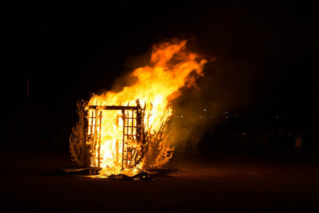 “This is a sacred fire. It’s not something that is just for getting warm or it looks cool. It’s actually a ceremony,” Eidinger says, noting that part of the experience is people being able to enter the structure and write missives or add papers to burn. “It should not be limited in size, within reason, and 5 feet isn’t reasonable.”