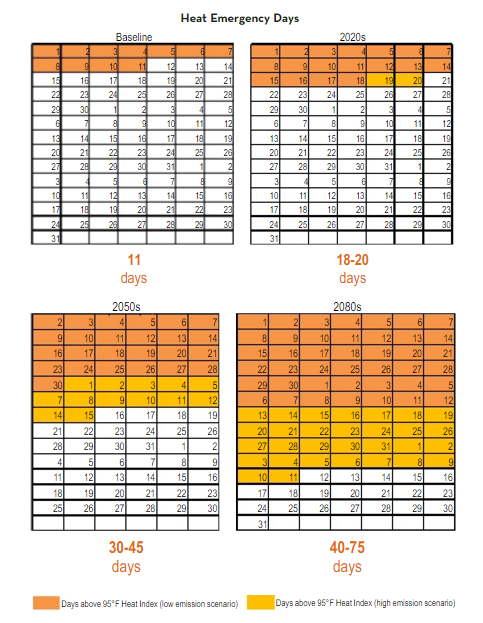 D.C. currently experiences around 11 heat emergency days per year, which could almost double to 20 days by 2020 and spike up to 75 days by 2080, according to the report. Washingtonians should also expect much warmer average temperatures; longer, hotter, and more frequent heat waves; and more frequent and intense heavy rain and flooding.