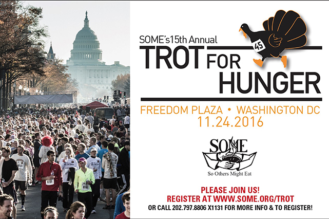 Are you looking to give back this Thanksgiving? Washingtonians are invited to join SOME (So Others Might Eat) on Thanksgiving Day for a 5k run/walk on Pennsylvania Avenue. The District’s only Turkey Trot, SOME’s Trot for Hunger is hoping to raise over $600,000 to continue to provide critical services such as food, clothing and healthcare to thousands of homeless and poor men, women and children in DC.