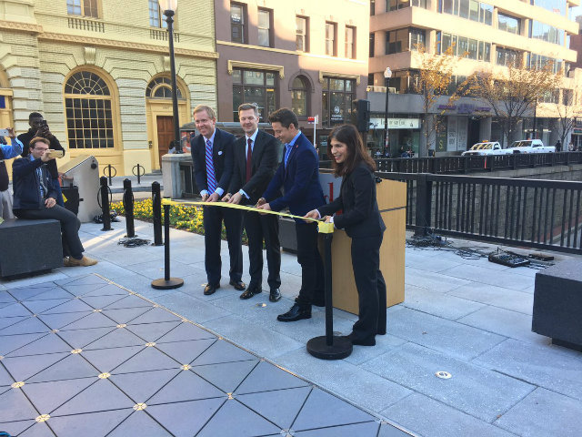 Earlier today the District Department of Transportation (DDOT) and the Golden Triangle Business Improvement District cut the ribbon on “the Connecticut Avenue Overlook,” located south of the Dupont Circle Metro station on Connecticut Avenue. The park features sidewalks that use technology called Pavegen pavers, a flooring material made from recycled polymer and truck tires that converts energy from pedestrian’s footsteps into electricity. The energy from the pavers is stored in batteries, which power LED accent lights in the park at night.