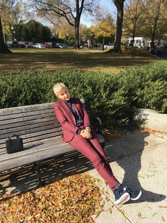 The comedian tweeted a photo of herself—looking bummed but dapper in a plaid, red suit—sitting on a bench in Lafayette Park. Degeneres was named one of the recipients of the Presidential Medal of Freedom this year. But she forgot her ID and was denied entry to the White House for today’s ceremony.