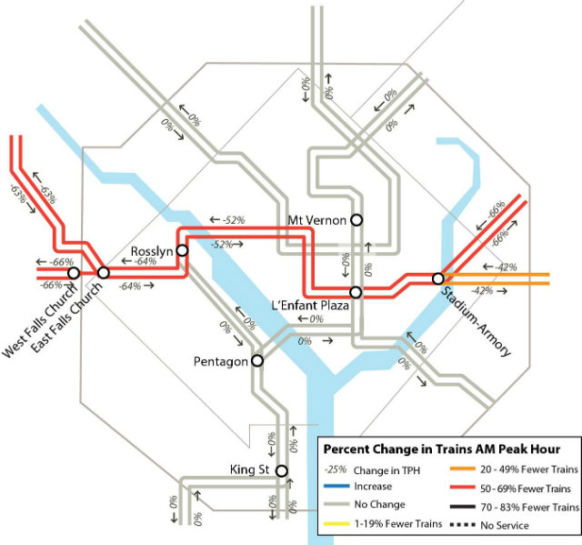 Between today and December 21, Orange Line trains between Vienna and New Carrollton and Silver Line trains between Wiehle-Reston East and Largo Town Center will run every 20 minutes. Blue Line riders at Rosslyn and into the District should also expect crowding as a result of the reduced capacity, and riders across the Orange and Silver lines will see service affected.
