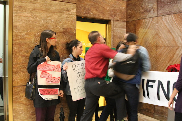 Around 15 protesters with IfNotNow, a Jewish activist group, marched inside the downtown building with signs. The activists were loudly but peacefully singing and speaking when two men wearing Normandy Real Estate Partners shirts shouted at the protesters, pushing them forcefully and grabbing at their signs. The activists responded by trying to shield each other and recording the incident on cellphones. It’s not clear if the two men were in any way affiliated with the RJC.