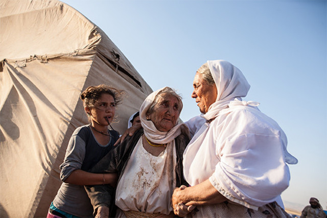 Goze, an 85-year-old Iraqi Yezidi woman, makes it to a refugee camp after escaping from ISIS in August 2014. Mackenzie Knowles-Coursin for the US Holocaust Memorial Museum.