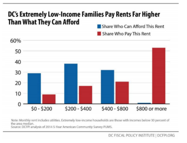 There are 43,000 D.C. households that are considered extremely low-income, according to the report. And 26,000 of them spend more than half of their income on rent. While one-third of these renters can’t afford to pay more than $200 per month, only nine percent have housing at that price. Meanwhile, the majority of them pay more than $800 on rent although almost none of them can afford it.