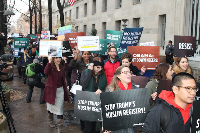 The event was co-organized by MoveOn.org and Desis Rising Up & Moving, and supported by a large coalition of social justice organizations. Marchers bore signs reading “Resist” and “Stop Trump’s Muslim Registry.” They chanted “Hear us loud, hear us clear, shut down NSEERS” and “We wanna live safe, we wanna live free, we don’t want no registry” as they marched down Pennsylvania Avenue.